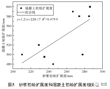 由图5可知,砂浆初始扩展度与混凝土初始扩展度相关系数R2为0.4799,相关性一般,但明显优于水泥净浆的试验结果,相关性提升了20倍。